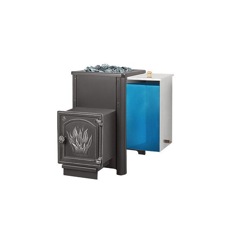 Эта модель дровяной печи предназначена для парного отделения объемом до 18 кубометров. Она обладает всеми преимуществами печей такого типа, включая независимость от газо- и электроснабжения, что позволяет использовать ее в загородных коттеджах. Основные элементы печи сделаны из конструкционной стали, устойчивой к высоким температурам, но колосниковая решетка и глухая топочная дверца сделаны из чугуна. Оба этих материала считаются максимально надежными, эффективными и долговечными – благодаря им печь прослужит не менее 10 лет. Еще одной особенностью этой модели является наличие навесного бака для воды объемом 49 литров.
