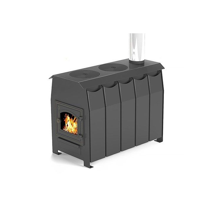 Эта дровяная печь отличается повышенной тепловой мощностью. Она рассчитана на обогрев больших помещений объемом до 300 кубометров. При этом габариты топки немного увеличены, так что в нее можно загружать поленья размером до 74 см. Кроме того, модель оснащена прочной варочной поверхностью с двумя конфорками, что позволяет использовать ее для приготовления пищи. К числу преимуществ этой модели относится также элегантный современный дизайн, благодаря которому она впишется в любое помещение. Чугунная топочная дверца печи снабжена вставкой из жаропрочного стекла, через которое можно любоваться пламенем.