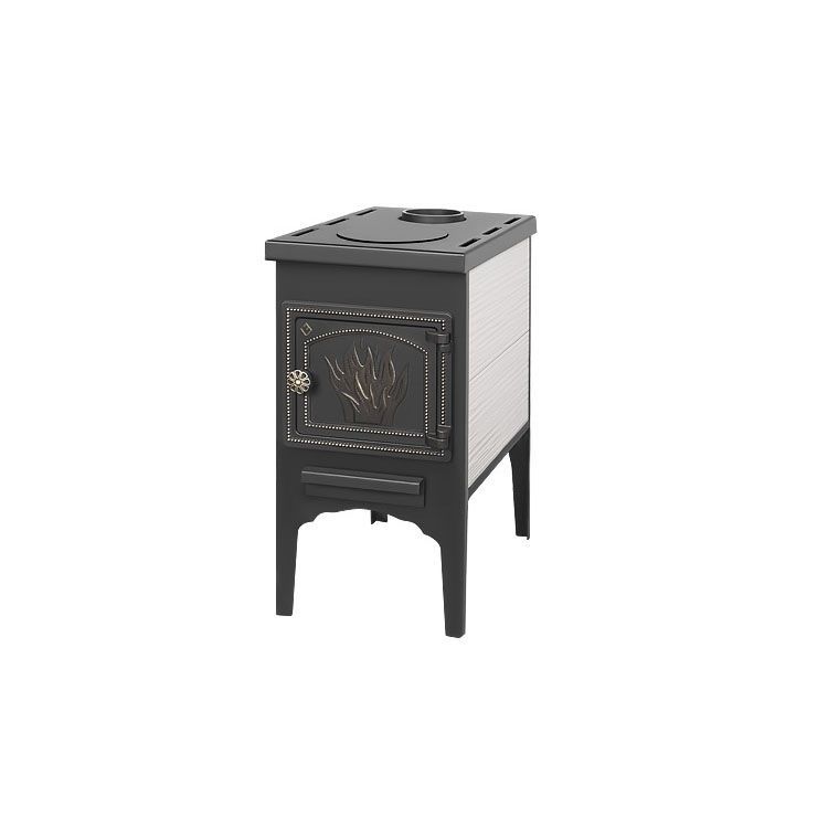 Эта компактная дровяная печь предназначена для установки в хозяйственных и подсобных помещениях. Несмотря на небольшие габариты, она отличается достаточно высокой мощностью, что позволяет использовать ее для обогрева помещений объемом до 100 кубометров. Корпус печи изготовлен из конструкционной стали, которая может выдерживать высокие температуры. Но при этом колосниковая решетка и глухая топочная дверца в наибольшей степени подверженные высоким нагрузкам, изготовлены из чугуна. Модель оснащена варочной поверхностью с одной конфоркой. Этого достаточно для того, чтобы можно было нагреть чайник или приготовить одно блюдо.