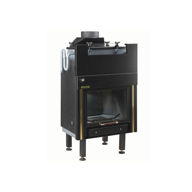 Эта модель представляет собой встраиваемый дровяной электрокамин, причем необычайно функциональный. Он не просто обогревает дом, но и может при этом нагревать воду для системы горячего водоснабжения. Этот термокамин не только функционален, но и очень красив. Его декоративное покрытие выполнено из матовой нержавеющей стали, не подверженной коррозии, отделка сделана из латуни. Кроме того, эта модель доступна в двух вариациях – либо с двойной дверью, либо с дверью типа «вверх-вниз». Оба варианта удобны и притом весьма эффектно смотрятся. Следует также выделить качественную фирменную систему безопасности термокамина.