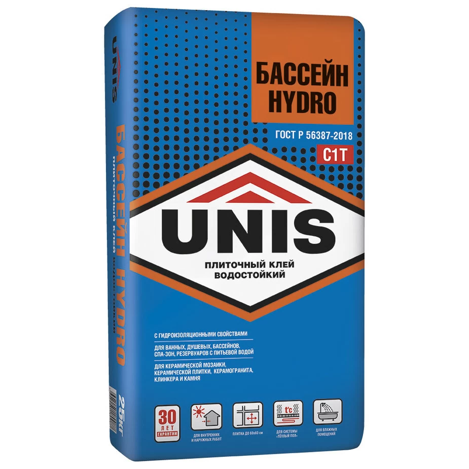 Плиточный клей Бассейн Hydro с гидроизоляционными свойствами для укладки керамической, керамогранитной (не более 60х60 см) и мозаичной плитки, плит из природного камня в резервуарах для воды (искусственных водоемов, чаш бассейнов), на пол и стены в любых помещениях – влажных, сухих, промерзающих и отапливаемых в т.ч. для облицовки помещений в спортивных комплексах, СПА-салонах, банях и саунах. Для наружных работ, облицовки цоколя и фасадов зданий.