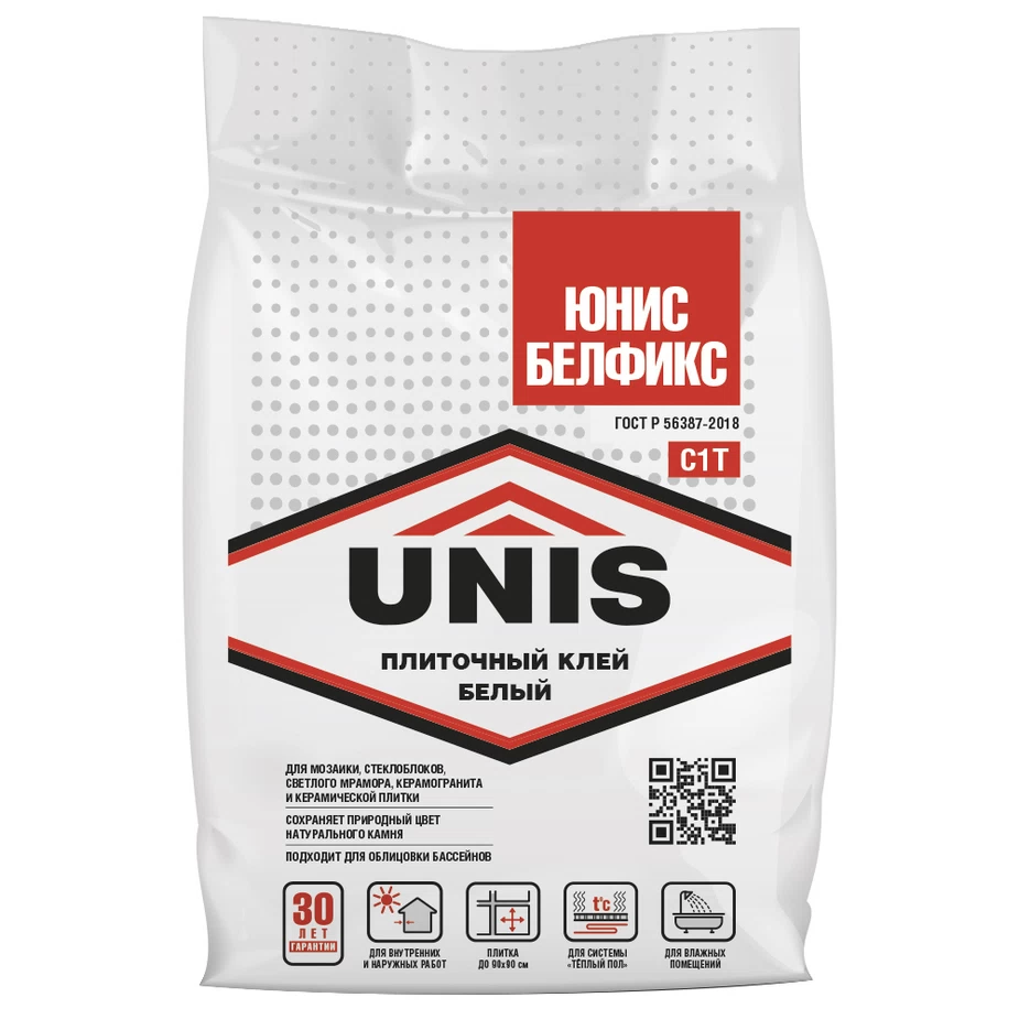 Клей на основе белого цемента. Для укладки керамической, керамогранитной, мозаичной и стеклянной плитки, стеклоблоков, плит из природного камня на пол и стены в любых помещениях: влажных, сухих, промерзающих и отапливаемых. Для наружных работ, облицовки зданий. «ЮНИС БЕЛФИКС» рекомендуется для сложных задач: укладки поверх старой плитки, применения в системе «Теплый пол», облицовки резервуаров для воды (бассейны). Может применяться в качестве затирки для плиточных швов или для создания художественно-декоративных эффектов (панно, рельефы и т.п.). Для внутренних и наружных работ.